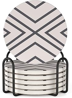 LIFVER 6 Piece Absorbent Stone Coaster Set with Holder, Ceramic Drink Coasters, Grey Lines, 4 Inch
