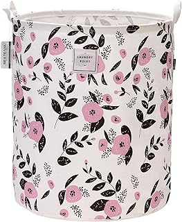 Sea Team 19.7インチ x 15.7インチ Lサイズ 折りたたみ式 円柱型 キャンバス生地 洗濯かご 収納バスケット 花柄 ピンク ブラック